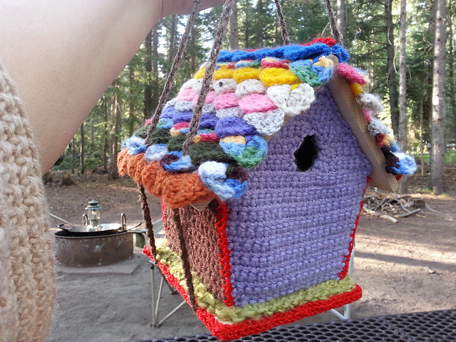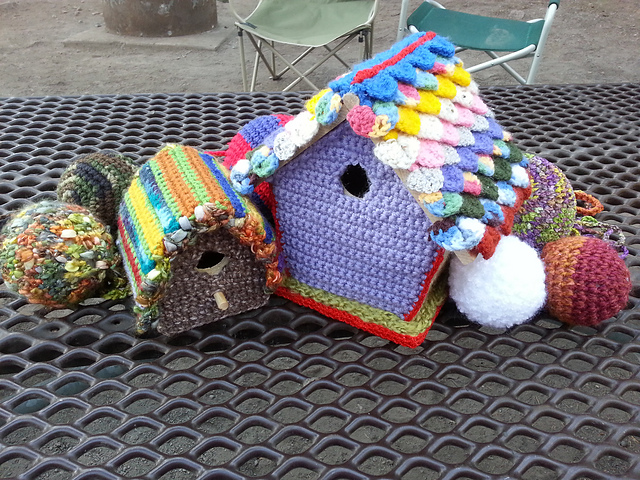 As people pass this way, they might see a yarn covered ornament swaying in the breeze, or a brightly colored birdhouse... and I hope they smile.