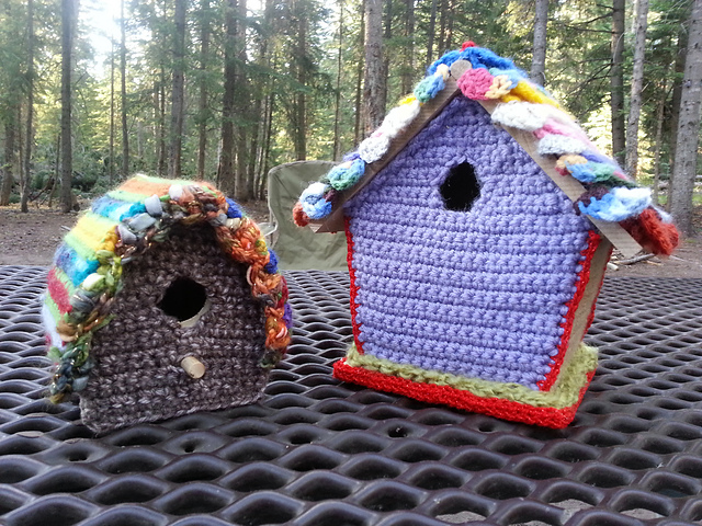 I decided on crocheted birdhouses... writing this reminder on the bottom of one to show my good intentions.