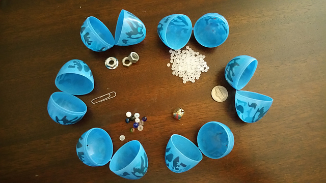 Here's what we came up with: nuts, plastic pellets, a nickel, a jingle bell, glass beads, and a large paper clip.